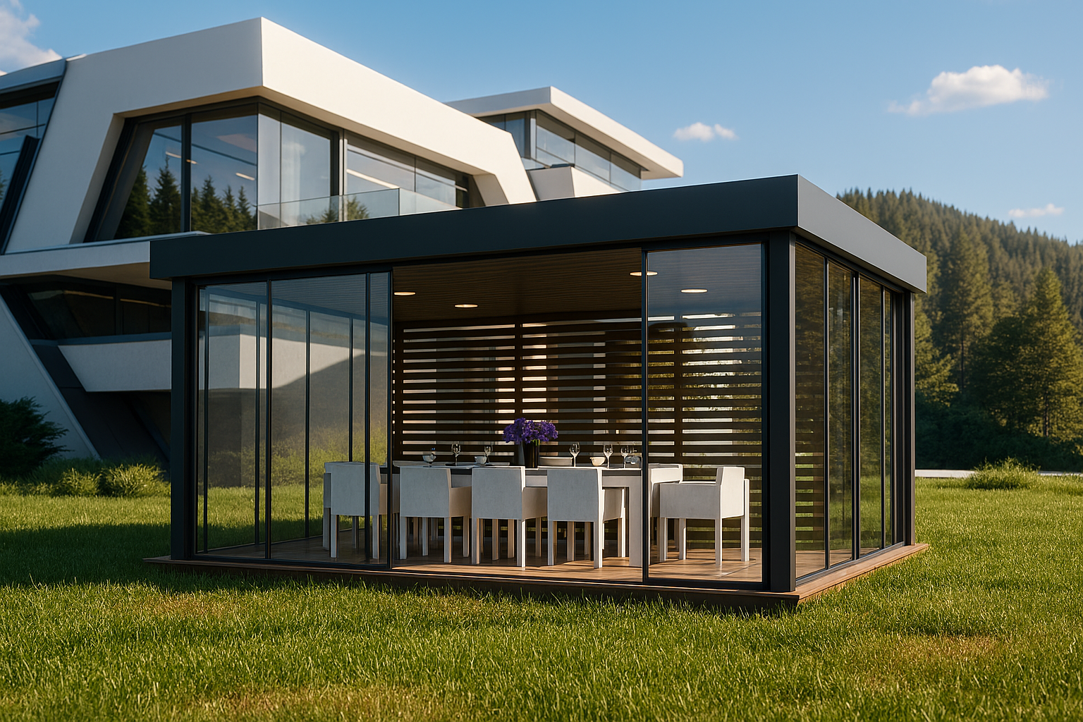 Carcasă metalică cu dimensiunile 6.0 × 4.0 m, prevăzută cu acoperiș înclinat pentru drenaj eficient